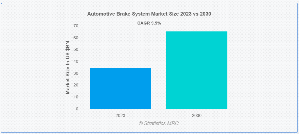 스트래티스틱스 MRC에 따르면 글로벌 자동차 브레이크 시스템 시장은 2023년 346억 달러 규모이며, 예측 기간 동안 9.5%의 연평균 성장률로 2030년에는 654억 달러에 달할 것으로 예상됩니다. 자동차 브레이크 시스템은 차량의 중요한 안전 부품으로, 필요 시 차량의 속도를 늦추거나 정지하도록 설계되었습니다. 일반적으로 브레이크 패드, 로터, 캘리퍼, 브레이크 라인, 마스터 실린더 등 몇 가지 주요 부품으로 구성됩니다. 운전자가 브레이크 페달을 밟으면 브레이크 라인을 통해 유압이 캘리퍼로 전달되고, 캘리퍼는 브레이크 패드를 로터에 압착하여 마찰을 일으키고 차량 속도를 늦춥니다. 브레이크 시스템의 오작동은 제동력 저하와 사고 위험 증가로 이어질 수 있으므로 브레이크 시스템의 효율성과 안전을 보장하기 위해서는 적절한 유지관리와 정기적인 점검이 필수적입니다.