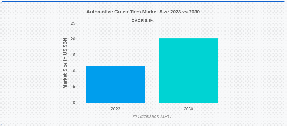 Stratistics MRC에 따르면 글로벌 자동차 그린 타이어 시장은 2023년 115억 달러 규모이며 예측 기간 동안 8.5%의 연평균 성장률로 성장하여 2030년에는 203억 달러에 이를 것으로 예상됩니다. 친환경 타이어 또는 저구름 저항 타이어라고도 하는 친환경 타이어는 연료 소비를 줄이고 환경에 미치는 영향을 최소화하도록 설계된 타이어 유형을 말합니다. 이러한 타이어는 연비를 개선하고 탄소 배출을 줄이며 자동차 산업의 전반적인 지속 가능성을 향상시키기 위한 특정 기능과 재료로 설계되었습니다. 친환경 타이어는 연료 소비와 온실가스 배출을 줄임으로써 환경 지속 가능성에 기여합니다. 또한 재활용 소재를 사용하거나 수명이 다한 후 재활용이 용이하도록 설계되어 환경에 미치는 영향을 더욱 줄일 수 있습니다.