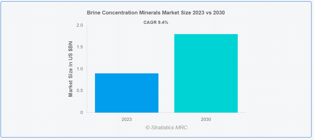 스트래티스틱스 MRC에 따르면 글로벌 염수 농축 미네랄 시장은 2023년 0.9억 달러 규모이며 예측 기간 동안 9.4%의 연평균 성장률로 2030년에는 18억 달러에 달할 것으로 예상됩니다. 염수 농축 미네랄은 염수라고 하는 농축 소금 용액에서 발견되는 물에 용해된 미네랄이 축적된 것을 말합니다. 이러한 미네랄에는 나트륨, 염화물, 칼륨, 마그네슘, 칼슘 등이 포함됩니다. 이러한 미네랄은 태양 증발, 역삼투압, 나노 여과와 같은 다양한 기술을 통해 농축됩니다. 이 과정을 통해 남은 소금물에서 농도가 증가하여 결정화될 가능성이 높아집니다.