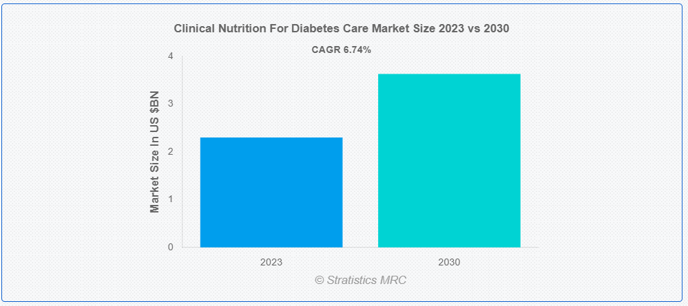 Stratistics MRC에 따르면 당뇨병 치료를위한 글로벌 임상 영양 시장은 2023 년에 23 억 3 천만 달러로 추정되며 예측 기간 동안 6.74 %의 CAGR로 성장하여 2030 년에는 36 억 3 천만 달러에이를 것으로 예상됩니다. 당뇨병 치료를 위한 임상 영양학은 당뇨병 환자의 혈당 조절과 전반적인 건강을 최적화하기 위한 맞춤형 식단 관리를 포함합니다. 이는 탄수화물, 단백질, 지방의 균형 잡힌 섭취를 강조하는 동시에 혈당 지수/부하 및 식사량 조절과 같은 요소도 고려합니다. 식이 권장 사항에는 탄수화물 섭취량 모니터링, 가공식품보다 자연식품 강조, 규칙적인 신체 활동 장려 등이 포함될 수 있습니다. 개별화된 식사 계획에는 종종 식단 선호도, 문화적 고려 사항 및 라이프스타일 요인이 통합되어 당뇨병 관리의 장기적인 준수와 성공을 지원합니다.