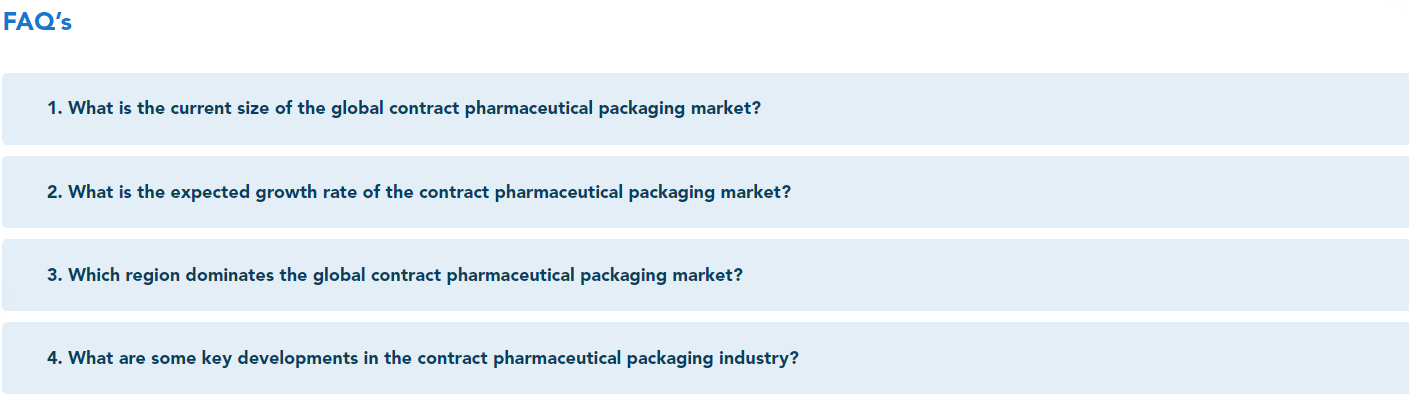 글로벌 제약 산업은 세계 경제 성장, 고령화 및 인구 증가, 신제품 출시에 힘입어 기하급수적인 속도로 확장되고 있습니다. IQVIA에 따르면 2020년 전 세계 제약 시장의 매출은 1조 2,652억 달러로 꾸준히 확대되고 있습니다. 많은 제약 공급업체는 상업용 및 임상용 패키징을 제약 계약업체에 아웃소싱하면 수익이 증가한다는 사실을 인지하고 있으며, 이에 따라 제약 업계에서 계약 패키징이 확대되고 있습니다.