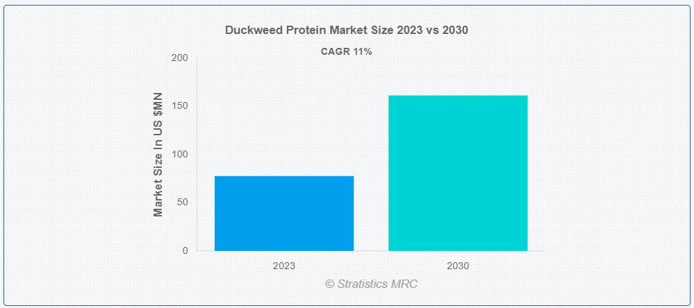 스트래티스틱스 MRC에 따르면 글로벌 덕위드 단백질 시장은 2023년 7770만 달러 규모이며, 예측 기간 동안 11.0%의 연평균 성장률로 2030년에는 1억 6132만 달러에 달할 것으로 전망됩니다. 작은 수생식물인 개구리밥은 지속 가능한 단백질 공급원으로서의 잠재력으로 주목받고 있습니다. 덕위드 단백질은 이 작은 부유 식물에서 추출하며 높은 영양가로 인정받고 있습니다. 필수 아미노산이 함유되어 있어 완전한 단백질 공급원이며 비타민과 미네랄이 풍부합니다. 더덕 단백질은 지방과 콜레스테롤 함량이 낮아 다양한 식단을 위한 건강한 선택이 될 수 있습니다. 빠른 성장과 다양한 환경 조건에서 잘 자라는 능력 덕분에 더덕 단백질은 세계 식량 안보 문제를 해결하고 전통적인 단백질 공급원에 대한 의존도를 낮출 수 있는 유망한 솔루션이 될 수 있습니다.