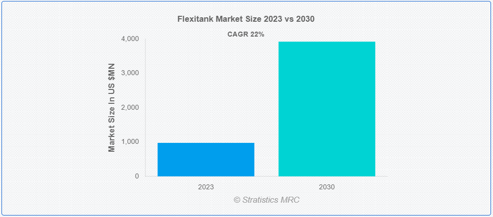 스트래티스틱스 MRC에 따르면 글로벌 플렉시탱크 시장은 2023년 9억 7,475만 달러 규모이며 예측 기간 동안 22.0%의 연평균 성장률로 2030년에는 3조 9,213만 달러에 달할 것으로 예상됩니다. 플렉시탱크는 일반적으로 벌크 액체 운송에 사용되는 위험하지 않은 액체의 운송에 사용되는 유연하고 접을 수 있는 컨테이너입니다. 폴리에틸렌이나 폴리프로필렌과 같은 다양한 폴리머로 제작된 플렉시탱크는 표준 20피트 화물 컨테이너에 맞도록 설계되어 저장 용량을 극대화하는 동시에 운송 비용을 최소화합니다. 이러한 컨테이너는 세척 및 반송 물류가 필요 없기 때문에 드럼이나 ISO 탱크와 같은 기존 운송 방법에 대한 비용 효율적인 대안을 제공합니다. 플렉시탱크는 일반적으로 식품, 산업용 화학물질, 의약품 등의 액체를 운송하는 데 사용되며, 글로벌 액체 물류에 안전하고 효율적인 솔루션을 제공합니다.