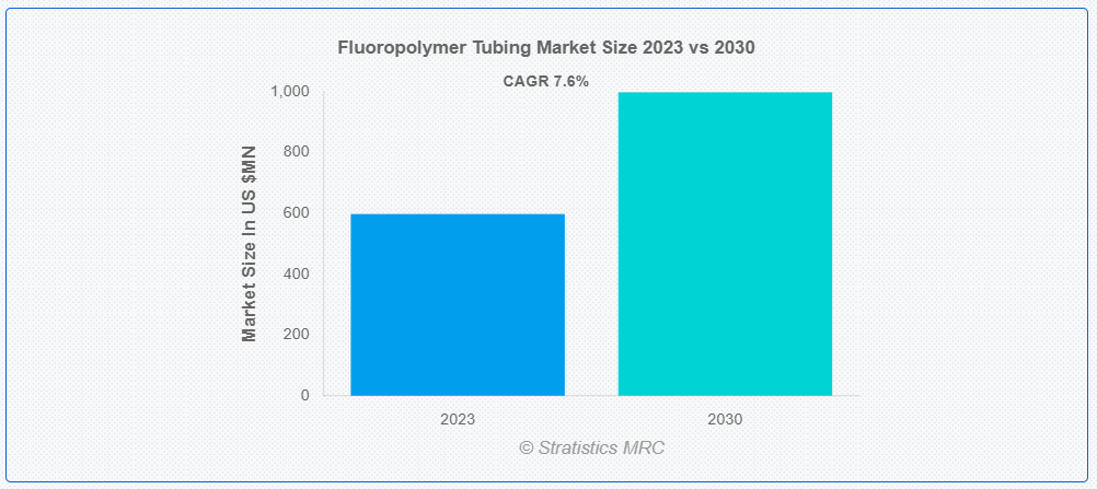 Stratistics MRC에 따르면 글로벌 불소수지 튜브 시장은 2023년 5억 9,766만 달러 규모이며 2030년에는 예측 기간 동안 7.6%의 CAGR로 성장하여 9억 9,803만 달러에 달할 것으로 예상됩니다. 플루오로폴리머 튜브는 뛰어난 내화학성, 열 안정성 및 전기 절연 특성으로 인해 다양한 산업 응용 분야에 적합하여 수요가 높습니다. 탁월한 내화학성, 열 안정성 및 비점착성 특성으로 유명한 불소수지 튜브는 다양한 응용 분야에서 광범위하게 사용되고 있습니다. 전자 산업은 열악한 환경과 화학 물질 노출로부터 배선 및 케이블을 보호하기 위해 불소 폴리머 튜브의 절연 특성에 의존합니다.