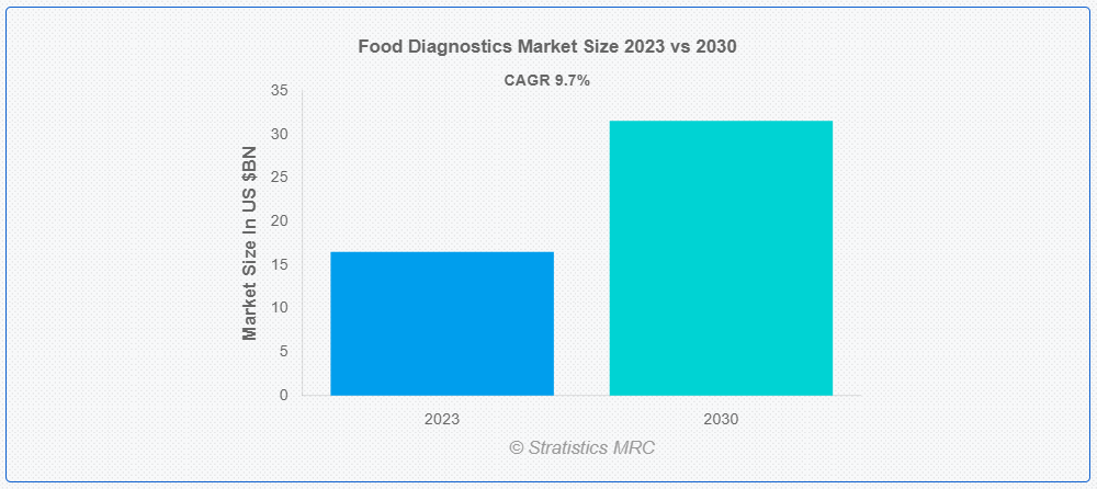 스트래티스틱스 MRC에 따르면 글로벌 식품 진단 시장은 2023년 165억 5천만 달러 규모이며, 예측 기간 동안 9.70%의 연평균 성장률로 2030년에는 315억 5천만 달러에 달할 것으로 예상됩니다. 식품의 안전과 품질을 보장하기 위해 식품 진단은 식품의 오염 물질, 병원균 및 기타 물질을 검출하고 분석하는 중요한 분야입니다. 연구원들은 DNA 분석, 크로마토그래피, 분광법과 같은 정교한 방법을 활용하여 알레르겐, 살충제, 박테리아, 독소 등 잠재적인 위험을 감지할 수 있습니다. 또한 신속하고 정확한 식품 진단은 식품 매개 감염을 예방하고, 법규를 준수하며, 일반 대중의 건강을 보호하는 데 필수적입니다.