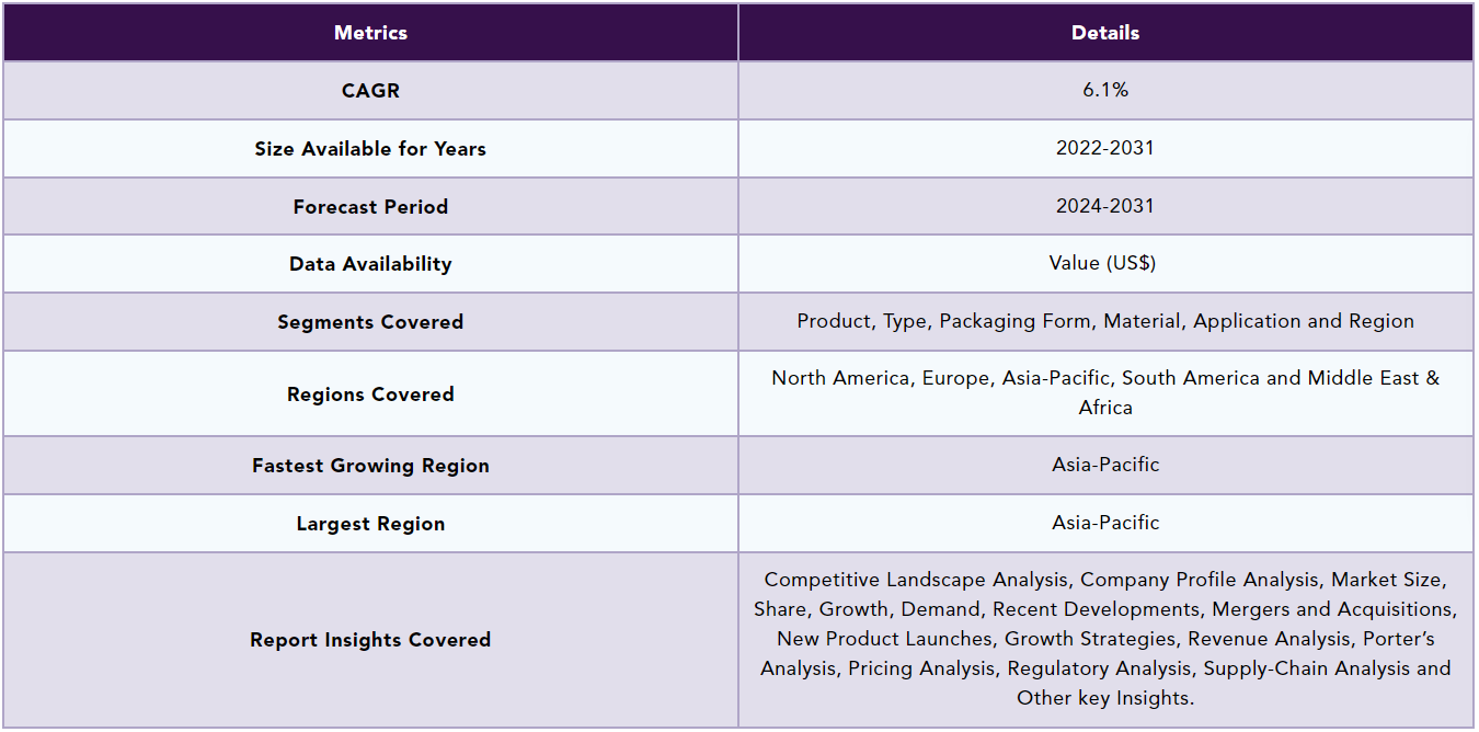글로벌 단열 포장 시장은 2023년에 166억 달러에 달하며, 2024년부터 2031년까지 연평균 6.1% 성장하여 2031년에는 263억 달러에 이를 것으로 예상됩니다. 전자상거래의 확산으로 인해 단열 포장에 대한 수요가 크게 증가하고 있으며, 이는 부패하기 쉬운 제품을 안전하게 보호할 수 있는 포장 솔루션의 필요성에서 기인합니다. 특히 신선한 식품에 대한 수요 증가가 단열 포장의 필요성을 더욱 부각시키고 있습니다. 아시아 태평양 지역은 단열 포장재 시장에서 중요한 성장 지역으로, 이 지역의 전자상거래 산업의 발전이 단열 포장에 대한 수요를 증가시키고 있습니다. 고객의 편의성과 품질을 중시하는 경향이 반영되어, 온도에 민감한 제품을 안전하게 배송하기 위한 포장 솔루션이 필수적입니다. 단열 포장 시장의 주요 동인은 전자상거래의 확대와 식품 산업에서의 수요 증가입니다. 그러나 생산 및 재료 비용, 지속 가능성 문제는 이 시장의 성장에 제약을 가하는 요소로 작용하고 있습니다. 특히, 환경 문제에 대한 관심이 높아짐에 따라 지속 가능한 포장 옵션에 대한 수요가 증가하고 있습니다. 단열 포장 시장은 제품, 유형, 포장 형태, 재료, 애플리케이션 및 지역에 따라 세분화됩니다. 제약 산업은 단열 포장 시장에서 중요한 역할을 하고 있으며, 고령화와 의료 서비스 개선으로 인해 의약품에 대한 수요가 증가하고 있습니다. 아시아 태평양 지역은 특히 식음료 부문에서 단열 포장에 대한 수요가 높아지고 있으며, 이는 도시화와 소비자 라이프스타일 변화에 기인합니다. 코로나19 팬데믹은 단열 포장 시장에 긍정적인 영향을 미쳤으며, 특히 식품 및 제약 산업에서의 수요가 급증했습니다. 그러나 공급망의 중단과 같은 어려움도 발생했습니다. 러시아-우크라이나 전쟁은 원자재 공급망에 영향을 미치며, 가격 변동성과 원자재 부족을 초래할 수 있습니다. 최근에는 새로운 온도 제어 포장 솔루션이 출시되는 등 혁신적인 개발이 이루어지고 있으며, 이는 지속 가능한 방식으로 온도에 민감한 제품을 안전하게 운송할 수 있도록 돕고 있습니다. 이러한 시장 동향을 반영하여, 단열 포장 시장의 세분화 및 주요 상업 자산을 이해하는 것이 중요합니다. |