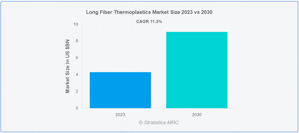 스트래티스틱스 MRC에 따르면 글로벌 장섬유 열가소성 플라스틱 시장은 2023년 43억 달러 규모이며 예측 기간 동안 11.3%의 연평균 성장률로 2030년에는 91억 달러에 달할 것으로 예상됩니다. 장섬유 열가소성 플라스틱(LFT)은 열가소성 폴리머와 긴 섬유, 일반적으로 유리 또는 탄소 섬유를 결합한 복합 재료의 일종입니다. LFT를 만드는 과정에는 긴 섬유에 용융된 열가소성 수지를 함침시킨 다음 냉각 및 응고시켜 단단한 복합 구조를 형성하는 과정이 포함됩니다. 이 제조 기술을 사용하면 열가소성 매트릭스 내에서 섬유의 분포와 방향을 고도로 제어할 수 있으므로 강도, 강성, 내충격성, 치수 안정성 등의 기계적 특성이 향상된 소재를 만들 수 있습니다.
