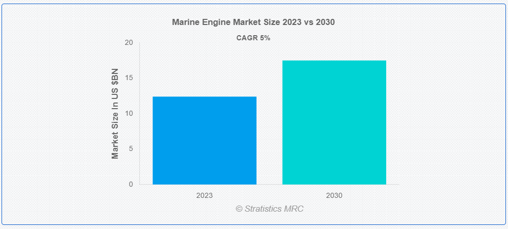 스트래티스틱스 MRC에 따르면 글로벌 해양 엔진 시장은 2023년 124억 달러 규모이며 예측 기간 동안 5.0%의 연평균 성장률로 성장하여 2030년에는 175억 달러에 달할 것으로 예상됩니다. 선박용 엔진은 해양 환경에서 사용하도록 특별히 설계된 내연 기관의 일종으로, 일반적으로 보트, 선박 및 기타 선박에 동력을 공급합니다. 이러한 엔진은 바닷물, 진동 및 다양한 기상 조건에 노출되는 등 해양 환경에서 작동하는 데 따르는 어려움을 견딜 수 있도록 설계되었습니다. 이러한 엔진은 저속에서의 높은 토크, 내식성, 작동 중 발생하는 열을 관리하는 효율적인 냉각 시스템 등 해양 애플리케이션의 요구 사항에 맞춘 기능과 사양으로 선박을 효율적이고 안정적으로 추진하는 데 필수적입니다.