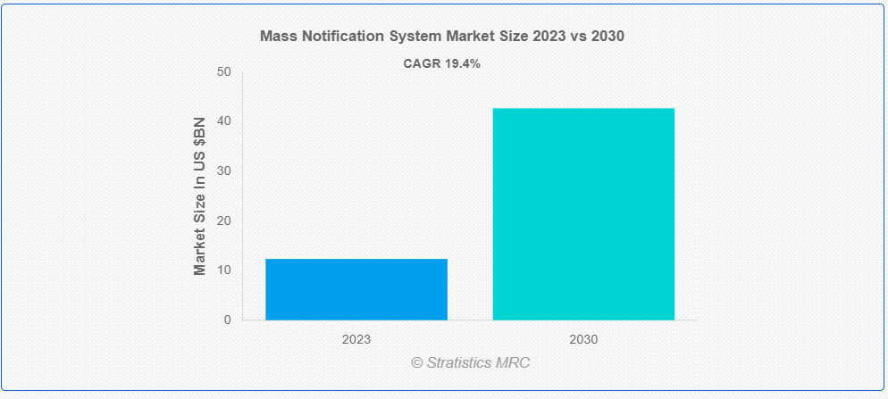 Stratistics MRC에 따르면 글로벌 대량 알림 시스템 시장은 2023년 123억 5,000만 달러 규모이며 예측 기간 동안 19.4%의 연평균 성장률로 성장하여 2030년에는 427억 1,000만 달러에 달할 것으로 예상됩니다. 많은 사람들에게 긴급 상황을 신속하고 효과적으로 알리기 위한 필수 도구는 대량 알림 시스템(MNS)입니다. MNS는 문자 메시지, 이메일, 전화, 소셜 미디어, 사이렌 등 다양한 커뮤니케이션 채널을 사용하여 사람들이 어디에 있든 중요한 알림, 경고 또는 지침을 신속하게 수신할 수 있도록 합니다. MNS는 시민들에게 악천후를 알리고, 직원들에게 직장에서의 비상 상황을 알리거나, 자연재해나 보안 위협과 같은 비상 상황 시 조치를 조직하는 등 안전을 강화하고 신속한 대응 시간을 촉진하는 데 필수적입니다.