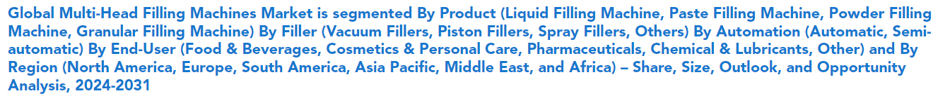 글로벌 멀티 헤드 충전 기계 시장은 제품, 필러, 자동화, 최종 사용자 및 지역을 기준으로 세분화됩니다.