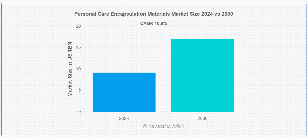 Stratistics MRC에 따르면 글로벌 퍼스널 케어 캡슐화 재료 시장은 2024년 91억 5천만 달러 규모이며, 2030년에는 예측 기간 동안 10.9%의 CAGR로 성장하여 170억 3천만 달러에 달할 것으로 예상됩니다. 퍼스널 케어 캡슐화 재료는 화장품 및 퍼스널 케어 산업에서 비타민, 향료 또는 보습제와 같은 활성 성분을 보호 껍질 안에 캡슐화하기 위해 사용되는 물질입니다. 이러한 물질은 민감한 성분의 안정화, 방출 제어, 효능 향상 등 다양한 용도로 사용됩니다. 캡슐화는 빛, 공기 또는 pH 변동과 같은 외부 요인으로 인한 활성 성분의 변질을 막아 제품의 유통기한을 연장하는 데 도움이 됩니다.