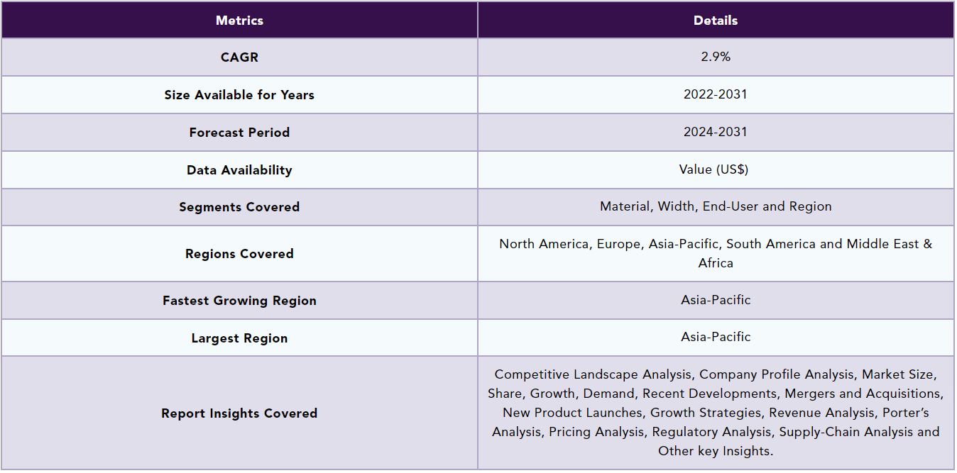 글로벌 파우치 테이프 시장은 재료, 폭, 최종 사용자 및 지역에 따라 세분화됩니다.