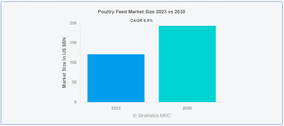 스트래티스틱스 MRC에 따르면 글로벌 가금류 사료 시장은 2023년 1,213억 달러 규모이며, 예측 기간 동안 6.9%의 연평균 성장률로 2030년에는 1,935억 달러에 달할 것으로 전망됩니다. 가금류 사료는 육류, 달걀 또는 깃털을 얻기 위해 사육되는 가축에게 제조되어 제공되는 특수 사료를 말합니다. 이러한 조류에는 일반적으로 닭, 오리, 칠면조, 거위, 메추라기 등이 포함됩니다. 가금류 사료는 각 종과 성장 단계의 영양 요구 사항을 충족하도록 설계되어 최적의 건강, 성장, 계란 생산 및 육질을 보장합니다. 일반적으로 곡물, 단백질 공급원, 비타민, 미네랄, 항생제나 프로바이오틱스와 같은 첨가제가 균형 있게 혼합되어 있으며, 새의 특정 요구 사항과 사용되는 농업 관행에 따라 달라질 수 있습니다.