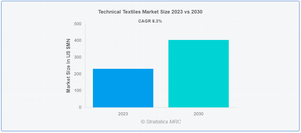 스트래티스틱스 MRC에 따르면 글로벌 테크니컬 텍스타일 시장은 2023년 2억 3,130만 달러 규모이며, 예측 기간 동안 8.3%의 연평균 성장률로 2030년에는 4억 4,420만 달러에 달할 것으로 예상됩니다. 테크니컬 텍스타일은 미적 또는 장식적인 목적이 아닌 특정 기능적 특성을 위해 설계 및 제조된 소재입니다. 이러한 섬유는 내구성, 강도, 유연성, 열 또는 화학 물질에 대한 내성 및 기타 특수 기능성과 같은 특정 성능 기준을 충족하도록 설계되었습니다. 고유한 특성과 성능의 장점으로 인해 자동차, 항공우주, 의료, 스포츠, 건설, 농업 등 다양한 산업 분야에서 활용되고 있습니다.